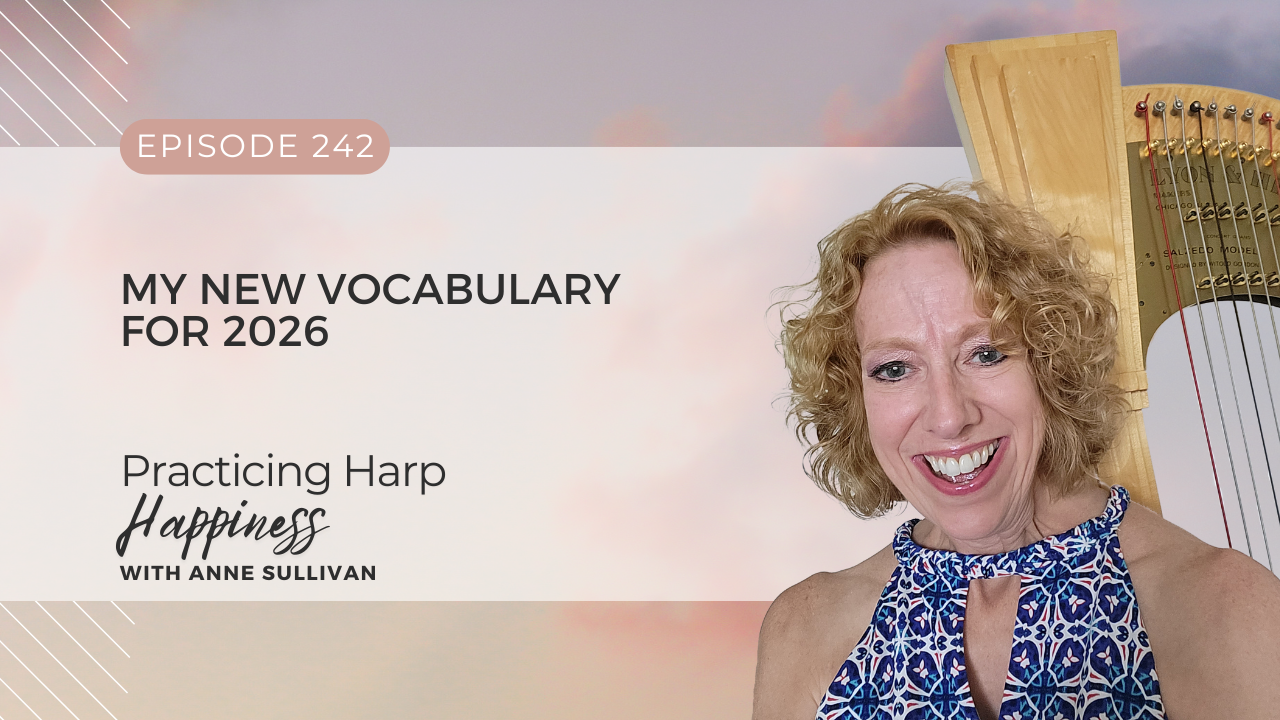 I’ll tell you my word - it’s actually two words - for 2026, but before I do that I want to share the words that I am rethinking for the coming year. My goal is to be more mindful of my language in my teaching, and that includes my teaching you on this podcast. These are words I use all the time so it will be an adventure for me, for sure, but if my 2026 vocabulary words help you reduce any negative charge that is impacting your harp playing, it will have been more than worth the effort.