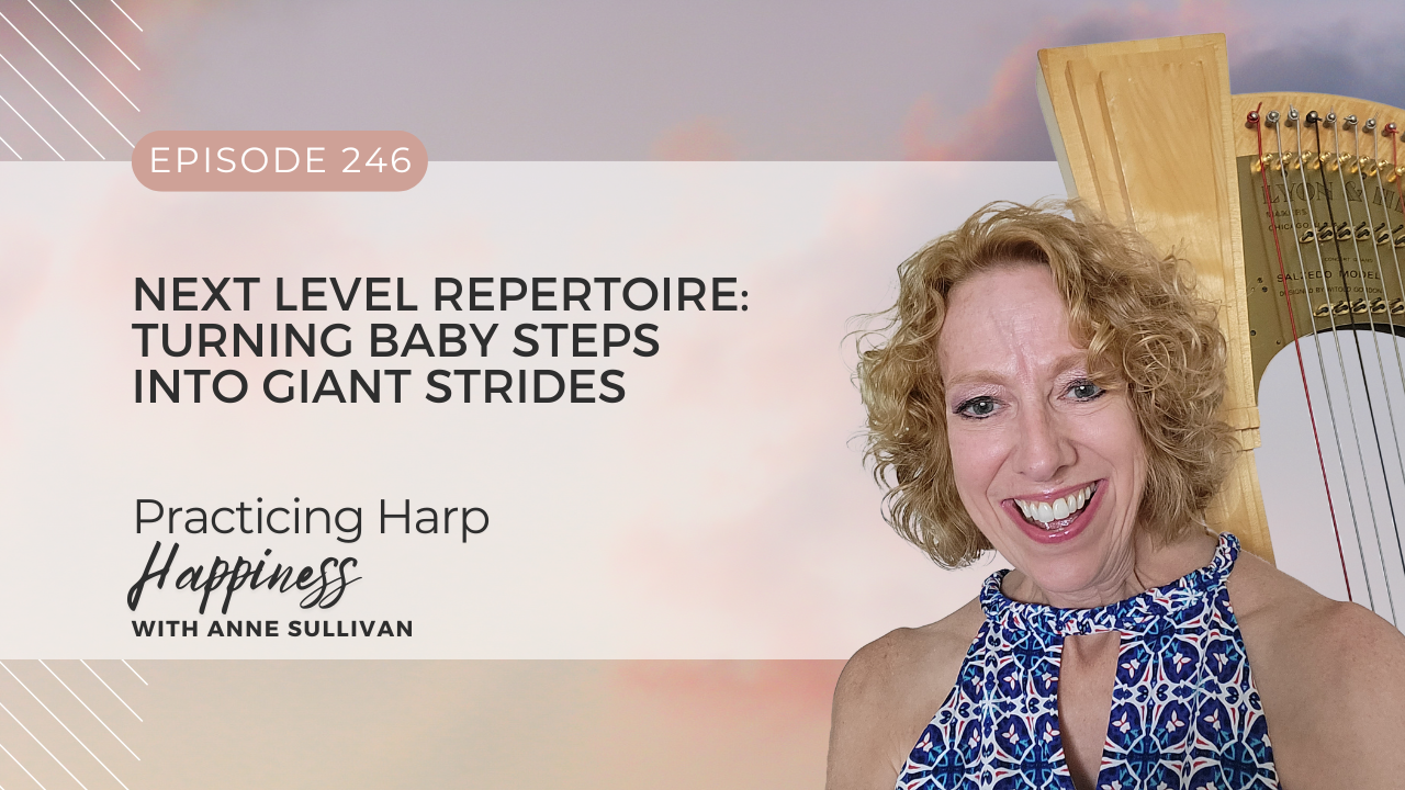 Neither choice feels good, mainly because we feel like we aren’t growing. We feel like our playing is staying at the same level. In fact, one of the reactions I see from harpists in this situation is that they choose to put aside the challenging piece and play another piece by a composer or arranger whose works they know they can play easily. Unfortunately, this can mean that the music they’re playing and the finger patterns they are learning don’t stretch them at all, but actually keep them stuck in the same place.